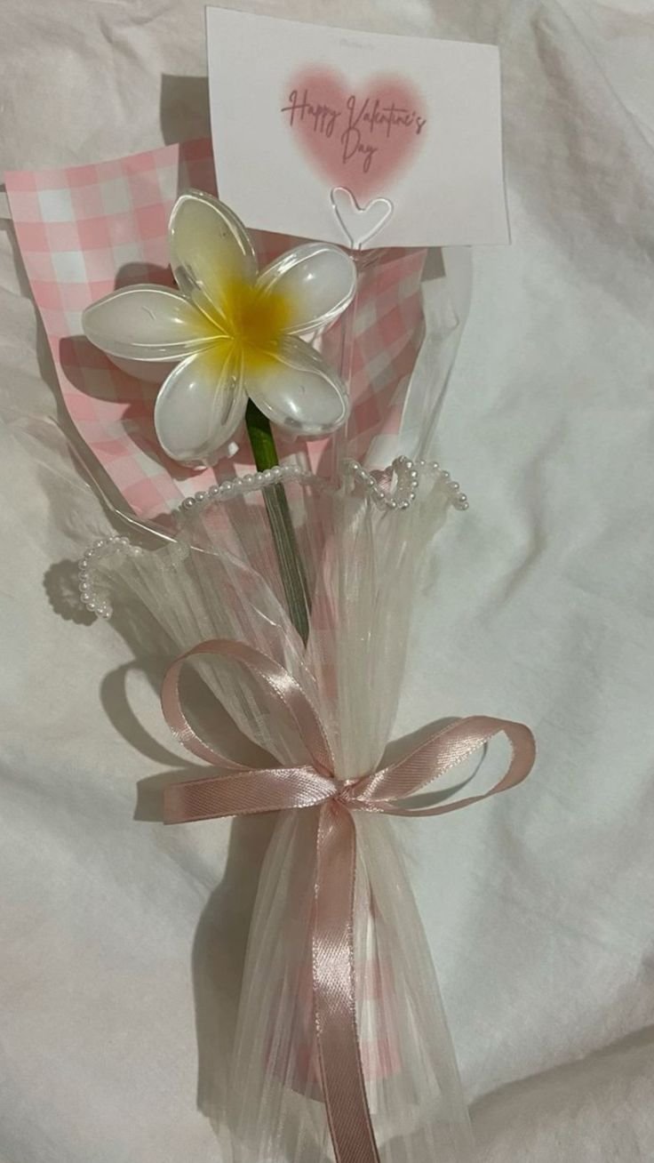 A beautifully handcrafted single artificial flower bouquet wrapped in soft pink checkered paper and premium transparent net fabric, finished with a satin ribbon bow and pearl detailing. Comes with a cute “Happy Valentine’s Day” card, making it a perfect romantic gift for special occasions like Valentine’s Day, anniversaries, or surprises.